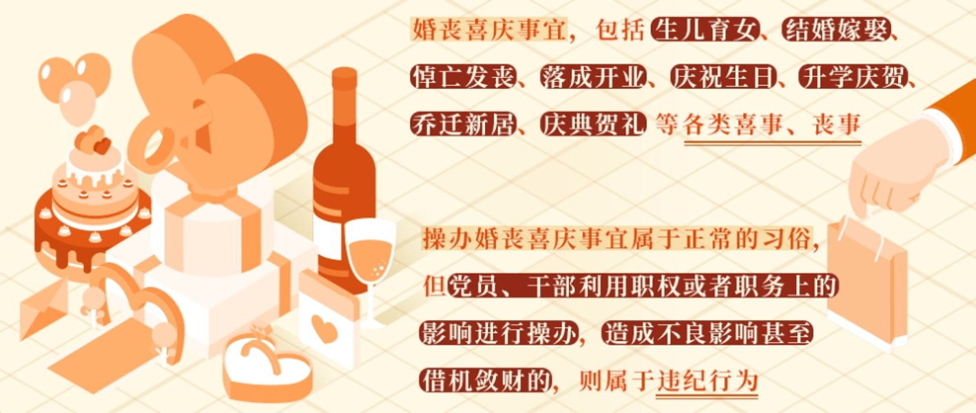 婚丧喜庆事宜本是日常生活中的人之常情,但有些党员利用职权或者职务上的影响大操大办婚丧喜庆事宜,造成了较为恶劣的影响,不但影响正常工作,甚至有的还成为借机敛财的手段。为严格制止这类行为,也是落实中央八项规定精神要求,作出本条规定。